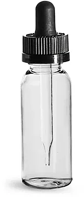 Clear Plastic Bottles, 1 oz PET Cosmo Round Bottles w/ Black Child Resistant Droppers