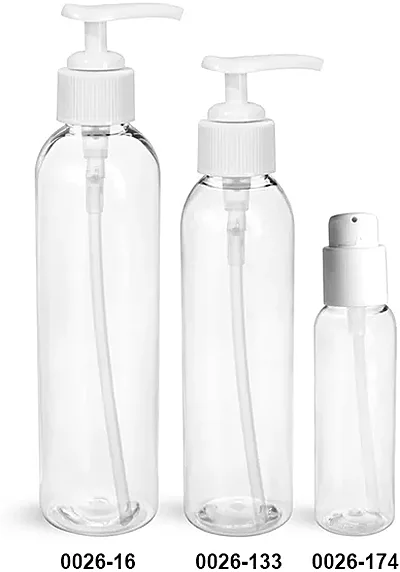 Each bag of clear plastic cosmo round bottles comes with the choice of white lotion pumps or treatment pumps. The clear PET plastic bottles allow your unique product to be clearly displayed. These slender cosmo round bottles could possibly package hand lotions or other skin care products.