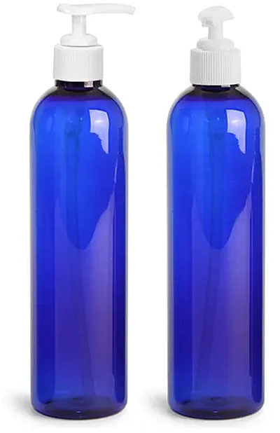 Plastic Bottles, Blue PET Cosmo Round Bottles w/ Lotion Pumps