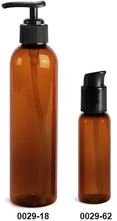 Plastic Bottles, Amber PET Cosmo Round Bottles w/ Black Lotion Pumps & Treatment Pumps