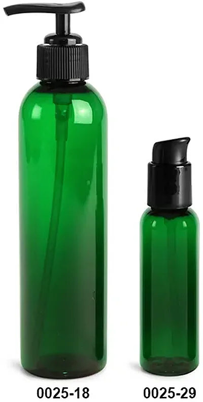 Plastic Bottles, Green PET Cosmo Round Bottles w/ Black Lotion Pumps & Treatment Pumps