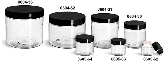 Plastic Jars, Clear PET Straight Sided Jars w/ Black Smooth Plastic Lined Caps