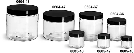 These clear straight sided jars are offered in an array of sizes and come with PE lined black polypropylene caps. These plastic jars could be used for a wide variety of products, such as cosmetics and creams.