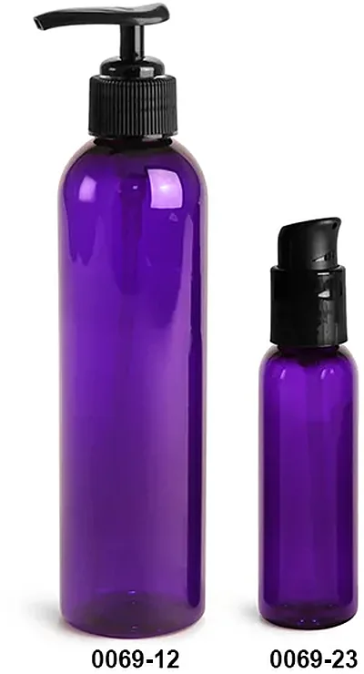 Plastic Bottles, Purple PET Cosmo Round Bottles w/ Black Lotion Pumps