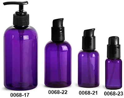 Brighten up your product line with purple PET boston round bottles with black dispensing pumps. These purple plastic bottles could be great for dispensing liquid soap, bath gel, or facial serum. The 1 oz, 2 oz, and 4 oz bottles come with black treatment pumps, while the 8 oz and 16 oz bottles are paired with black lotion pumps. Each plastic pump features a locking mechanism for clean and easy storage. Read More...