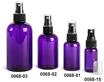 Plastic Bottles, Purple PET Boston Round Bottles w/ Black Fine Mist Sprayers