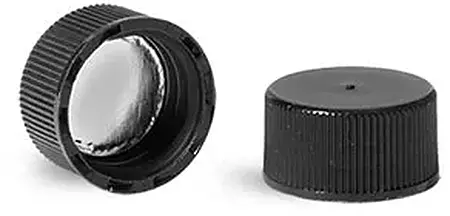The black polypropylene ribbed caps come with a foil liner, which enhances their barrier properties. These plastic caps are available for purchase in bags of 144 pieces, by the case of 2,000 pieces, or in a case pack of 14,500 pieces.