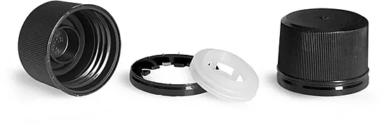 These 33 mm black polypropylene ribbed caps feature a tamper evident ring and pouring insert. Once secured in the place the tamper evident ring will snap away from the cap when opened, and the LDPE pouring insert will set into the neck of the bottle. These tamper evident caps could be used with oils, liquors, and much more.