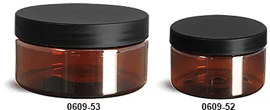 Plastic Jars, Amber PET Heavy Wall Jars w/ Frosted Black Lined Plastic Caps