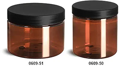 Plastic Jars, Amber PET Straight Sided Jars w/ Frosted Black Lined Plastic Caps