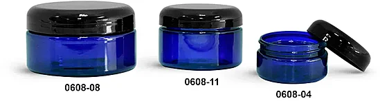 Plastic Jars, Blue PET Heavy Wall Jars w/ Black Dome Caps