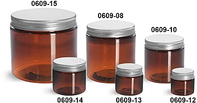 Amber PET plastic jars with aluminum lids are available in a variety of sizes that can be used create a bold look for products, such as shaving balm, body butter, hair care products, and more. Amber PET provides barriers against UV rays, moisture, and oxygen, helping to maintain product shelf life. Paired with these amber plastic jars are silver aluminum caps with PE-F217 liners, which are versatile and resistant to many chemicals. Read More...