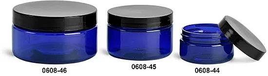 Plastic Jars, Blue PET Heavy Wall Jars w/ Black Smooth Lined Caps