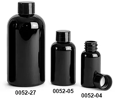 Plastic Bottles, Black PET Boston Round Bottles w/ Black Smooth PE Lined Caps