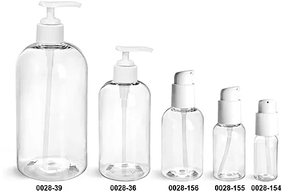 PET Plastic Bottles, Clear Boston Round Bottles w/ White Lotion Pumps & Treatment Pumps
