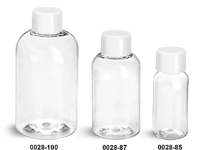 These clear PET boston round bottles come with white smooth PE lined caps, and are available in several sizes. Choose our clear plastic bottles with smooth white caps for a variety of products from shampoos and body washes to pharmaceuticals and chemicals. Read More...