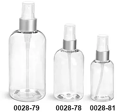 These clear PET boston round bottles are available with white and silver fine mist sprayers. Each white sprayer features a streamlined brushed aluminum silver shell. These clear plastic bottles could be an ideal packaging solution for a variety of bath and body care products such as hair spray, body mist, fragrances and more. Read More...
