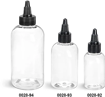 Need bottles with twist top caps for your product line? Consider our clear PET boston round bottles with black twist top caps! With three convenient sizes, these clear plastic bottles might be ideal for dispensing products such as glues, paints, inks and more. Open the cap by twisting the tip counterclockwise and close it by twisting the tip clockwise.
