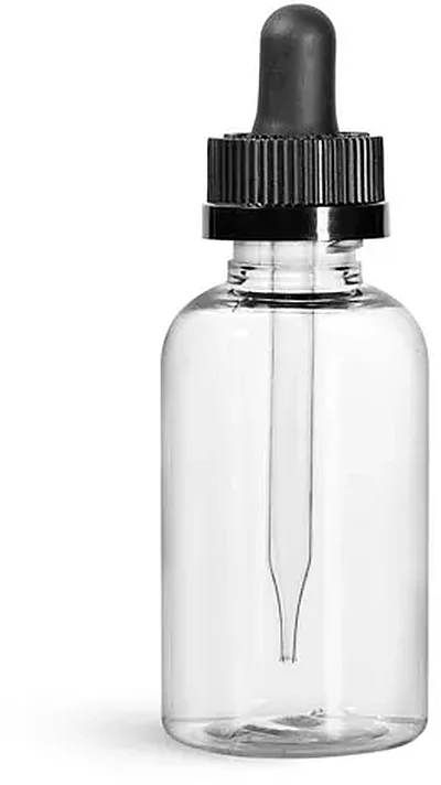 Plastic Bottles, 2 oz Clear PET Boston Round Bottles w/ Black Child Resistant Droppers