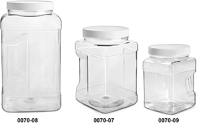Plastic Jars, Clear PET Square Gripped Wide Mouth Jars w/ White PE Lined Caps