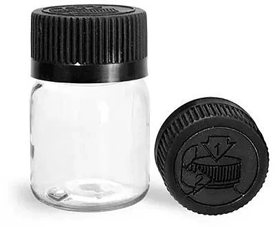 These clear PET wide mouth bottles are sold with black child resistant caps. The black PE lined child resistant caps have the "universal picture" printed on the top. Once screwed onto the bottles, the black child proof caps are removed by turning while pressing down on the top. This added security makes these wide mouth bottles useful storing products that can include pills, chemicals, and solvents.
