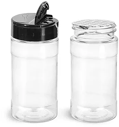This clear spice bottle comes with a black cap featuring a PS 113 pressure sensitive liner with the words "Sealed for Freshness" printed on top to help further protect your product. The PS 113 liner is a pressure sensitive liner that adheres to the top of the container once the closure or cap is securely screwed on. This spice cap has 2 openings; one side of the snap cap has three holes (0.300" diameter) for sifting, while the other has one spoon size opening, making this product ideal for seasonings, spices, sprinkles, herbs, and many other toppings!