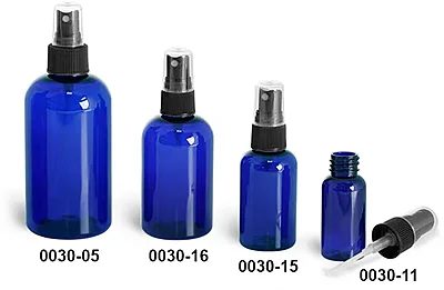 Our blue PET boston round bottles are available in five sizes with black ribbed fine mist sprayers. The black fine mist sprayers will dispense with ease in a mist for products that could include room sprayers and body care products. Be sure to test your products with these blue PET boston round bottles to ensure accurate dispensing.