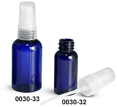 Plastic Bottles, Blue PET Boston Round Bottles w/ Natural Treatment Pumps