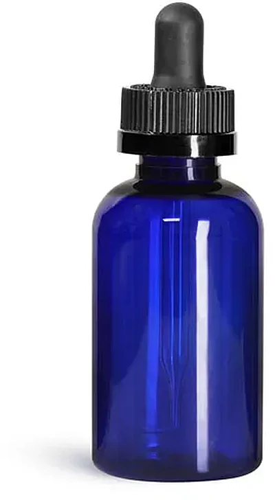 Plastic Bottles, 2 oz Blue PET Boston Round Bottles w/ Black Child Resistant Droppers