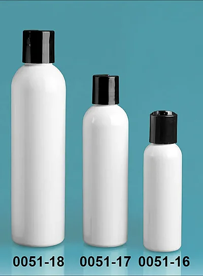 The white PET cosmo round bottles are available with black polypropylene disc top caps. The disc top caps allow for a small amount of product to be dispensed when the closure's orifice is exposed. The 2 oz and 4 oz bottles have caps with .270 mm orifices, while the 8 oz and 16 oz bottles come with caps that have .310 mm orifices. These white plastic bottles may be good choices for dispensing bath and body care products such as lotions, shampoos and conditioners, liquid soaps, and more!
