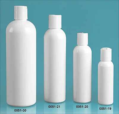 These white plastic cosmo round bottles are available in a range of sizes from 2 oz to 16 oz and come with matching white polypropylene disc top closures. Disc top caps allow for the convenient dispensing of a small amount of product when light pressure is applied to expose the closure's orifice. The 2 oz and 4 oz bottles have caps with .270 mm orifices, while the 8 oz and 16 oz bottles come with caps that have .310 mm orifices. These plastic bottles with disc top caps could be used to package a variety of bath and body products from lotions to hair care products.