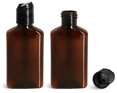 Plastic Bottles, 100 ml Amber PET Oblong Bottles w/ Black Disc Top Caps
