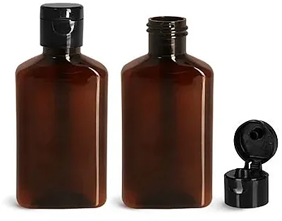 Plastic Bottles, 100 ml Amber PET Oblong Bottles w/ Black Snap Top Caps