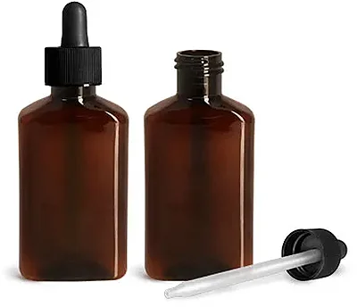 Plastic Bottles, 100 ml Amber PET Oblong Bottles w/ Black Bulb Plastic Droppers