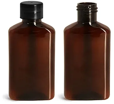 Plastic Bottles, Amber PET Oblong Bottles w/ Smooth Black PE Lined Caps