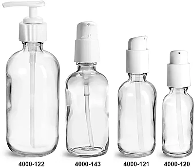 Clear Glass Bottles, Boston Round Bottles w/ White Pumps