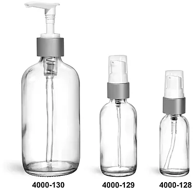 Glass Bottles, Clear Glass Boston Round Bottles w/ Brushed Aluminum Pumps