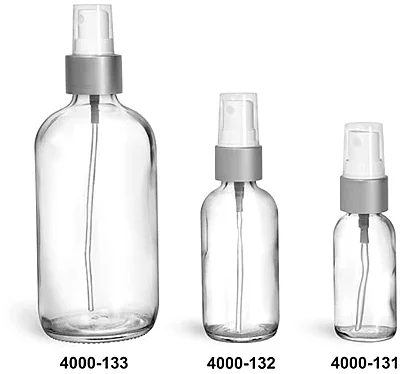 Glass Bottles, Clear Glass Boston Round Bottles w/ Brushed Aluminum Sprayers