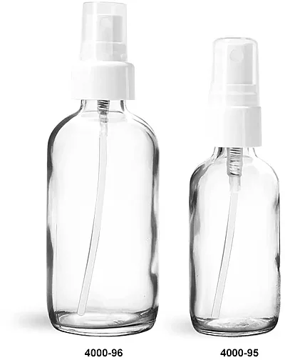Glass Bottles, Clear Glass Boston Round Bottles w/ White Smooth Fine Mist Sprayers