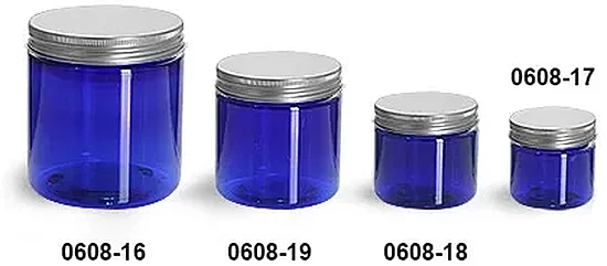 Choose blue plastic jars with aluminum lids in the range of sizes below for products that could include lip balms, lotions, bath salts, and more. The blue plastic jars composed of PET in the straight sided style provide a vibrant color that can accent your branding with ease. The silver aluminum caps included have PE-F217 liners for assisting in protecting your products during storage and have anti rust components. Be sure to test these blue plastic jars with aluminum lids when creating your stylish product line.