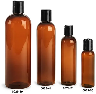These amber plastic cosmo round bottles come with black disc top caps included with your order. These bottles are made with PET plastic and all bags are heat sealed to keep the bottles clean and protected. These bottles will make any product look sharp and would be a fine addition to any line.
