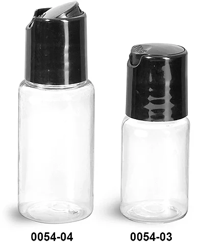 The clear PET round bottles are available in 1/2 oz and 1 oz sizes and come with smooth black polypropylene disc top closures. The disc top caps have .270" orifices and are ideal for evenly dispensing small amounts of product. These small clear plastic bottles could be used to package paints, inks and other industrial products.