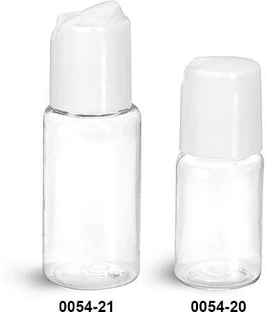 These small clear plastic bottles come with white polypropylene plastic disc top closures which allow for convenient and even dispensing of the bottle's contents. To dispense, simply apply light pressure to the indented area of the cap to expose the .166" orifice and squeeze the bottle. To seal the orifice and prevent leakage when not in use, press down on the open end of the cap. These plastic bottles could be ideal for packaging small volumes of paints, inks, dyes and more.