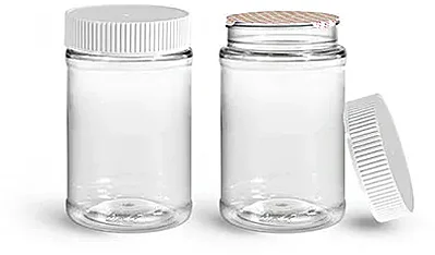 Food Jars, 16 oz Clear PET Plastic Jars w/ White Ribbed Induction Lined Caps