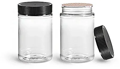 Food Jars, 16 oz Clear PET Plastic Jars w/ Black Ribbed Induction Lined Caps