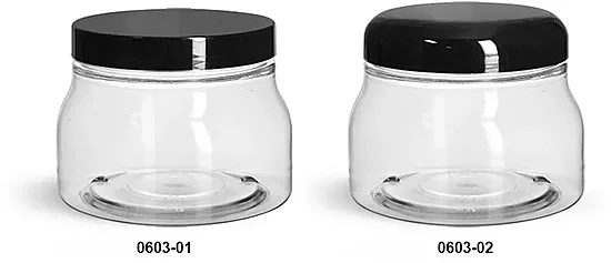 The clear PET tuscany jars are available with your choice of a smooth black dome cap or a smooth black straight sided cap. Both cap options are made of polypropylene plastic and come with a PE liner. Use these cap and container combinations to package many products such as creams, lotions, body scrubs, bath salt, and more!