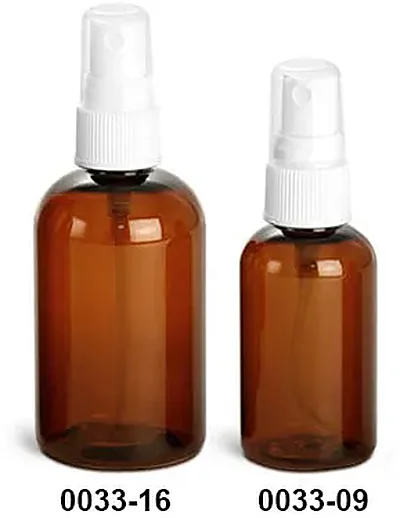 The amber PET boston round bottles are available in various sizes accompanied by a white ribbed fine mist sprayer. The white polypropylene fine mist sprayers include clear styrene hoods for preventing unwanted discharge while storing.