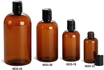Amber PET plastic bottles accompanied with black polypro disc top caps. These smooth black disc top caps offer easy dispensing for many products such as lotions, soaps, and shampoos. The amber boston round bottles come in various sizes all provided in bulk quantities to suit your needs.