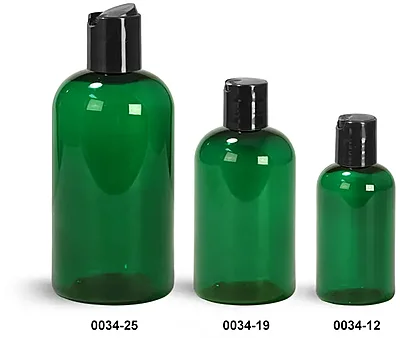 The 2 oz, 4 oz, and 8 oz, green PET plastic bottles come with black polypropylene disc top closures. These smooth black disc top caps offer easy dispensing for many products such as lotions, soaps, and shampoos.