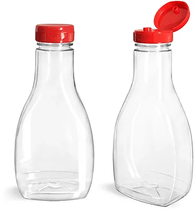 Plastic Bottles, Clear PET Oblong Sauce Bottles w/ Red PS22 Lined Snap-Top Caps